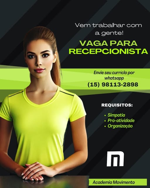 Recepcionista para Academia em Sorocaba Vaga para Recepcionista p/ (Unidade Iguatemi) – Horário tarde e noite! Buscamos meninas pró-ativas, com foco em Vendas e atendimento ao cliente, com TOTAL Disponibilidade de Horário e ser maior de 18 anos! Pode nos enviar seu currículo em PDF no whatsapp 15981550375