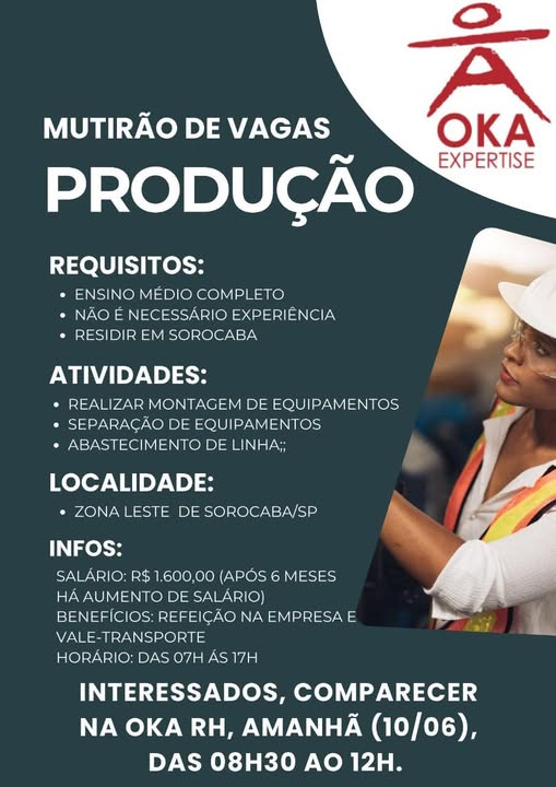 Mutirão de empregos para a área de produção Mutirão de empregos para a área de produção! Ensino médio completo Disponibilidade para trabalhar em horário administrativo Oportunidade para 1 emprego Interessados, comparecer na Oka RH, das 09h ao 12h, com currículo atualizado. Rua Newton Prado, n256, Vila Hortência!